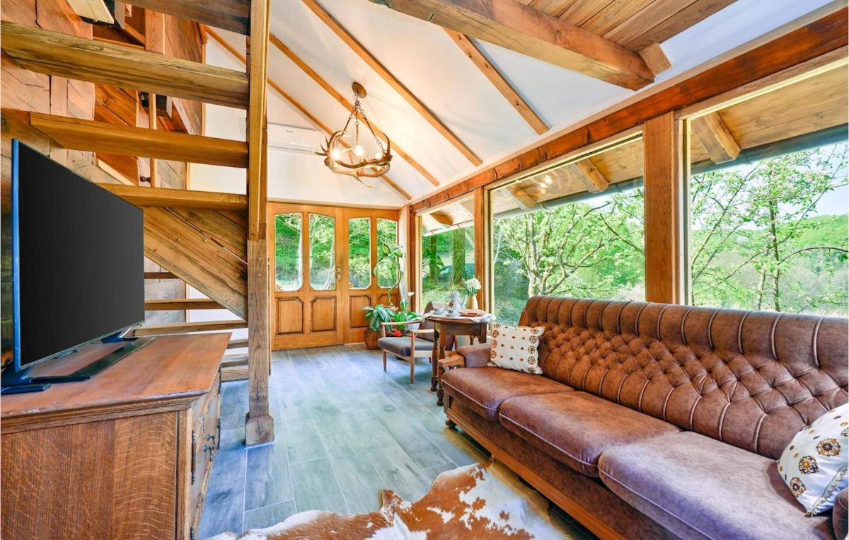 The holiday home with a terrace and garden views features 2 bedrooms, a living room, a flat-screen TV, an equipped kitchen with a dishwasher and an oven, and 1 bathroom with a hot tub. Towels and bed linen are provided in the holiday home. There is also a seating area and a fireplace.